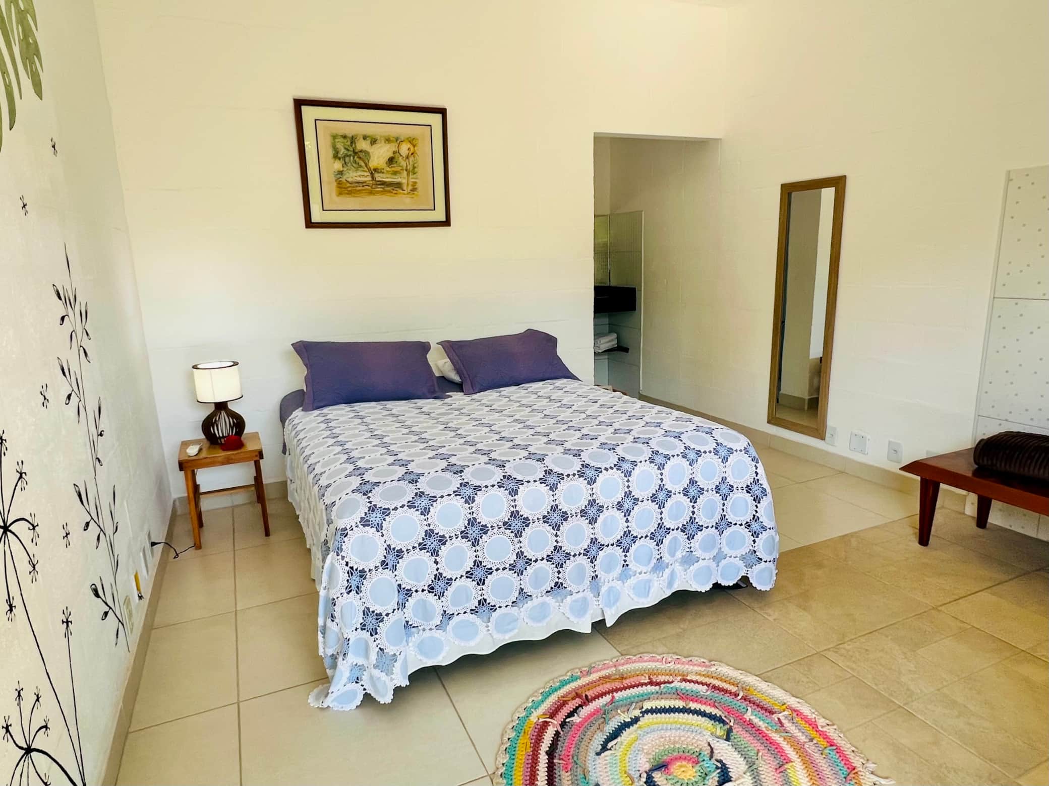 O Flat Aroeira (2 pessoas) oferece cama queen-size, banheiro privativo, bancada com cooktop e frigobar.